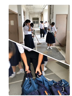 放課後は、毎日の感謝を込めて、校舎の清掃です。掃除をするときは、カバンをきれいに並べてから掃除を開始します。きれいな場所は、心もきれいにしてくれます。