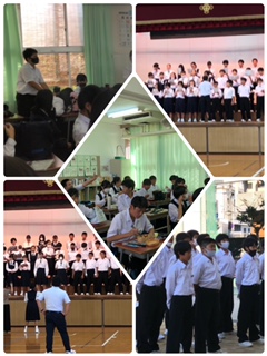 本日は、秋晴れの中、少し汗ばむ陽気でした。この気候にも負けず、69期生の歌の練習は、熱気に包まれるくらい各クラス頑張っていました。