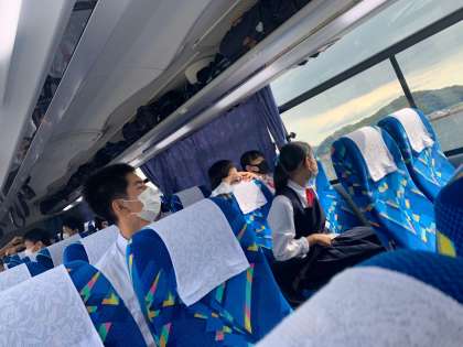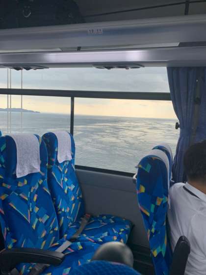 生徒たちは、バスの中から渦潮がないかのぞいています。