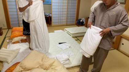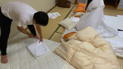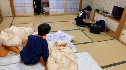 眠い目をこすりながら布団の片付け、着替え、今日の荷物の確認をしています。
