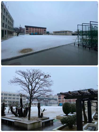 今日は、早朝から雪の舞い散る中でのスタートとなりました。登校時にも降っていたので、少しウキウキした気分になった人もいるかもしれませんね。学校では、運動場にも雪が積もっており、より一層寒さを感じさせました。