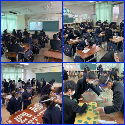 今日の2年生土曜授業は、阪神淡路大震災に関するビデオ鑑賞と百人一首練習を行いました。