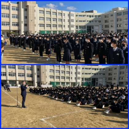 全校生徒の点呼確認が終わるまでに要した時間が約3分半。私語も無く、スムーズに避難し、整列や点呼も素早くするなど、本当に真剣に取り組むことができました。概ね5分を切ると合格点だそうなので、今日の訓練は成功といえるでしょう。