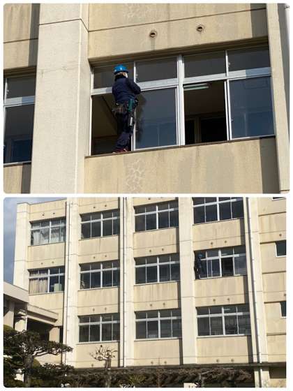 本日、土曜日ですが業者の方に学校内の窓清掃を行っていただいています。