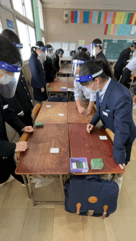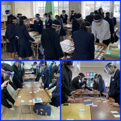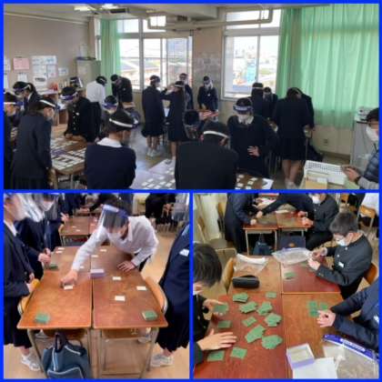 今日の5・6限目は、来週に迫った百人一首大会のクラス交流戦でした。マスクにフェイスシールド着用の上、教室も換気をしながらの取り組みです。