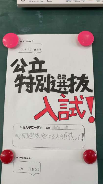教室のカウントダウンカレンダーには、今日、試験を迎えた生徒へのメッセージなどが見られます。