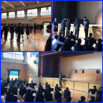 はじめに、先日行われた百人一首大会個人の部の表彰です。松竹梅の各部それぞれで表彰を行い、賞状の伝達を行いました。入賞されたみなさん、おめでとうございます。