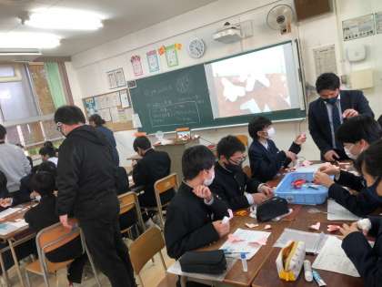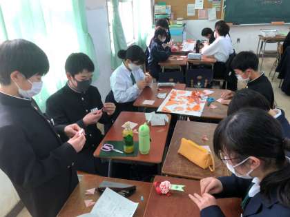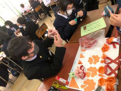 先立って、先週金曜日の放課後に、コサージュづくりの伝達講習が行われました。本日は、講習に来た小さな先生たちが各班で班員の指導にあたります。生徒は、それぞれが心を込めて作製にあたっています。