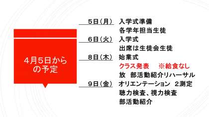 5日(月)は、6日(火)に行われる70期生の入学式準備を在校生が行ってくれると聞いてます。