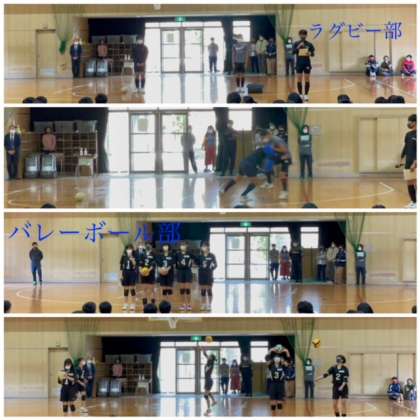 写真は、家庭科部、水泳部、ラグビー部、バレーボール部の様子です。