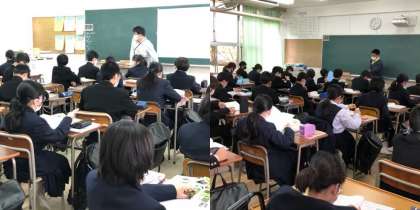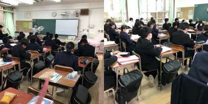 1組は末吉先生の数学です。算数から数学にかわって少し難しい様子でしたが真剣に聞いていました。