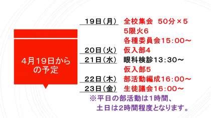 それに伴い、明日明後日と短時間で仮入部を行い、22日【木】に部活動編成をさせていただきます。