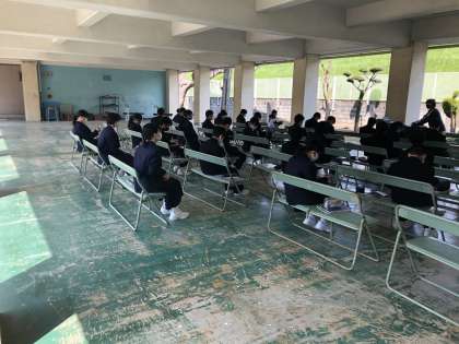 ピロティという広場で授業をしています。みんな音楽の井元先生の話を真剣に聞いていました。