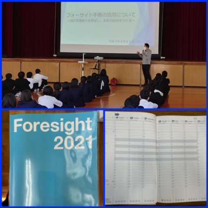 その「忘れないための工夫や仕掛け」の一つが手帳です。この度、3年生では、また一つ新しい取り組みとして、「フォーサイト手帳」という中高生向けのシステム手帳を導入し、自己管理能力や先を見通す力の育成に取り組むことになりました。