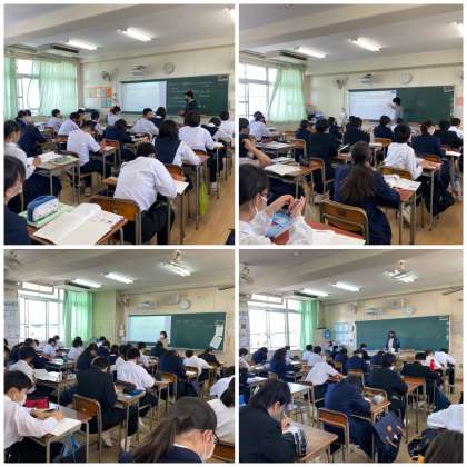 2枚目の写真は5限の対面授業の様子です。みんなの元気な声が響き渡り、積極的に授業に参加する様子がみられました。対面で一緒に授業をする時間が減るのは残念ですが、少なくなったこの2時間の対面授業を大切にし、みんなが前向きに授業に取り組んでいる姿がとてもうれしかったです。