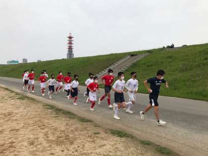 今日はミーティングで、感染対策のさらなる徹底の意識づけと実践、今後の予定と具体的な共通目標を確認し、淀川河川のサイクリングコースでジョギングを行い汗を流し、久々に触るボールの感触を確認しました。