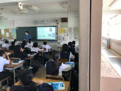 理科の授業の様子です。パワーポイントで資料を提示したり、Teamsに資料をアップロードしたりとICT機器を積極的に活用しています。