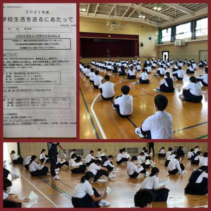 また、「学校生活をおくるにあたって」という冊子を使って、細かな規則の共通理解も図りました。こちらもおろそかになっている部分がないか、自己チェックしてお互いが気持ちよく学校生活をおくれるようにしましょう。