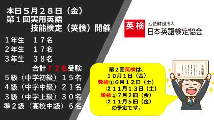 第1回の受検者は、1年生17名、2年生17名、3年生38名の合計72名となります。
