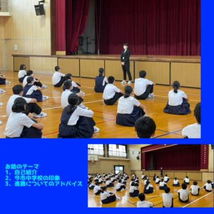 「今日は3つのお話をさせてもらいます。1つ目は自己紹介、2つ目は今市中学校の印象、3つ目は進路についてです。