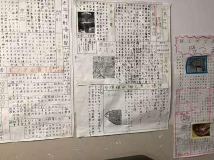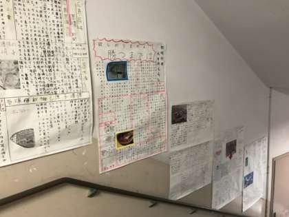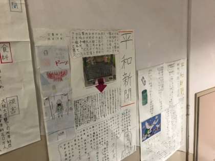 本日は放課後に平和学習の班長や中心メンバーが集まり壁新聞の張り出しを行いました。1年生校舎の1階から3階までの階段付近に張り出しています。この階段を利用する他学年の生徒も見てくれていました。皆さんも休憩時間等でぜひ他のクラス・班の作品を見てください。