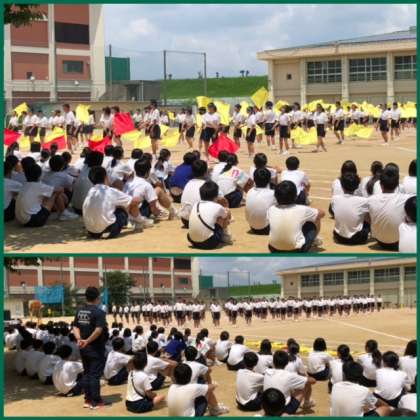 3限の途中から、1,2年生も運動場に出て集団演技を見学しました。3年生の集団行動やフラッグなど圧巻の演技を見て圧倒されているようでした。熱い中、素晴らしい演技を見せてくれた3年生の皆さん、有難うございました。またお疲れさまでした。