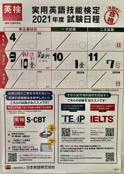 英検を受検する生徒は、忘れずに学年の英語科の先生まで申し込みをお願いします。