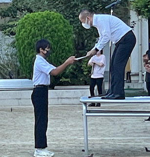 今日の全校集会で、野球部と水泳部が表彰されました。野球部は大阪市秋季大会で3位になり、部長が賞状を受け取りました。現在、府の大会でベスト8まで進んでいます。府大会の試合はまだ続きます。健闘を祈っています。