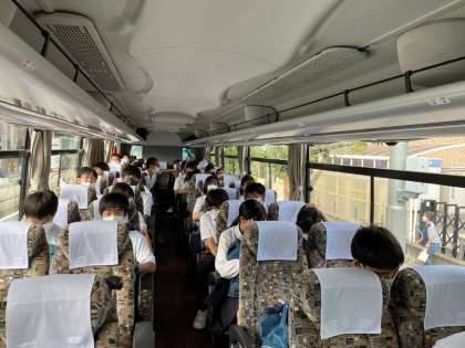 バスに乗り込みました。 3組の写真です。