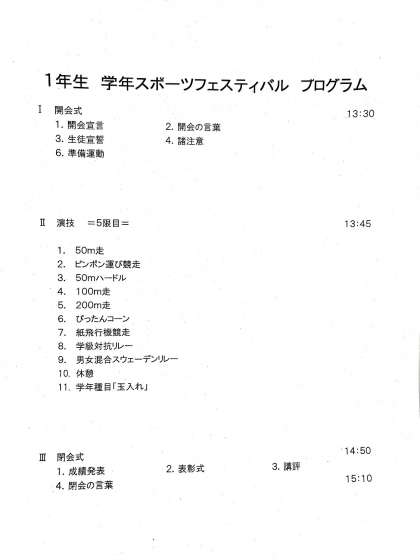 1年生スポーツフェスティバルタイムテーブル
