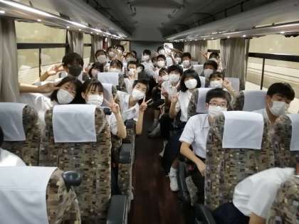 サービスエリア出発後の3年1組です!男女で仲良く楽しく、DJ岡田先生の音楽CDを聞いています!