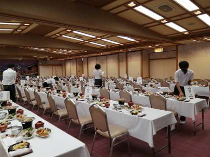 食事係、部屋に荷物を置きすぐに集まって仕事をしています。
