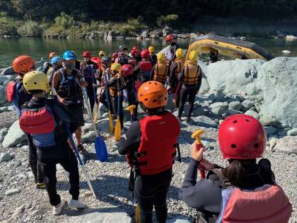 ラフティング班に分かれてガイドさんの指示を聞いています