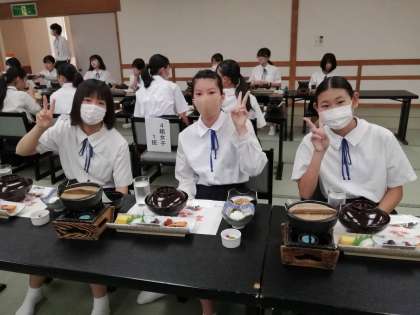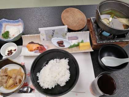 豪華な朝食に顔もほころびます!お鍋の中はお味噌汁です。