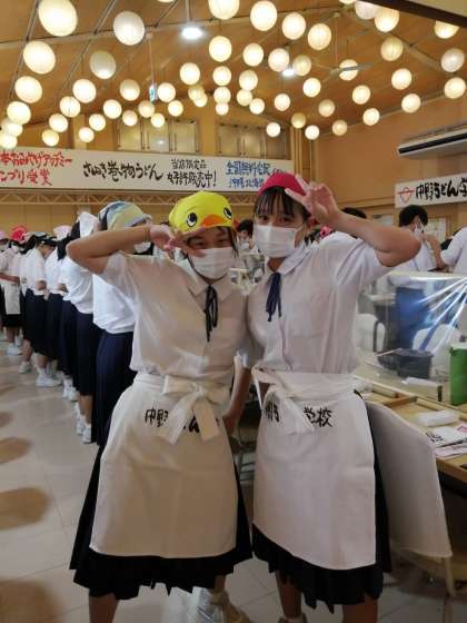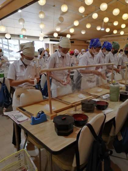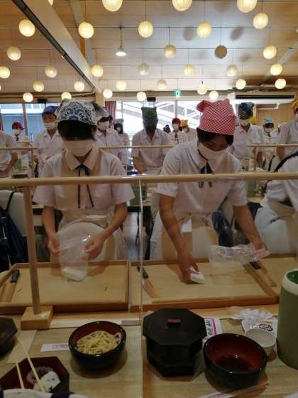 職人さんのような白いエプロンをつけ、ついに、うどん作り開始です!