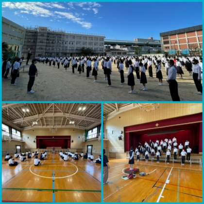 さて、写真にもあるように、音楽の授業で合唱練習が行われました。コロナの影響で、ビデオでの鑑賞となる中、その撮影のための並び方などの確認も含めた練習です。