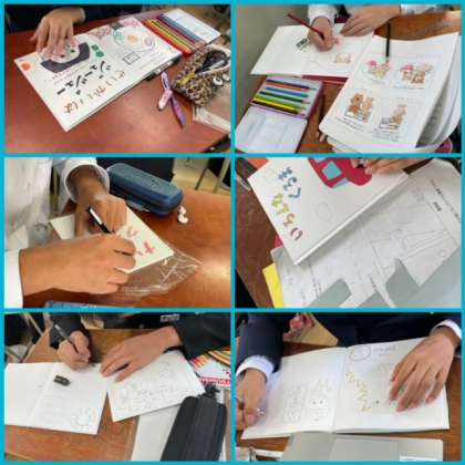 修学旅行や中間テストを終え、いつも通りの生活を送る3年生。そんな中、休み時間など寸暇を惜しんて「絵本」の作成に取り組んでいる姿があちらこちらで見かけます。