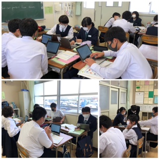 写真は今日の英語の授業の様子です。"Which items should you pack in your emergency bag?" 「防災バッグの中身に何を持っていくべきか」というテーマでグループで話し合いをしました。難しいテーマですが、どのクラス、どの班も一生懸命考えて、文を作っていました。タブレットの使い方も非常に慣れており、情報を集めたり、難しい語を翻訳したりとフルで活用していました。