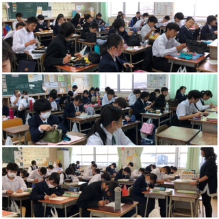 今日は給食の提供がありませんでしたので、昼食はご家庭で作ってもらったお弁当を食べました。貴重なお弁当デーに生徒たちはワクワク。各ご家庭の愛情のこもったお弁当を美味しそうに食べていました。ただ、ご時世により黙食をしないといけないので、話をしたい気持ちはやまやまのようでしたが、ぐっと我慢していました。