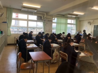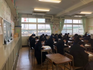 3学期が始まって3日目です。今日は大阪府下で一斉のチャレンジテストが実施されました。今日のチャレンジテストに向けて、2学期の期末テスト後はどの教科も対策の授業を行ったり、冬休みの宿題もテストを見据えた課題が出ていましたが、生徒の皆さんは実力を発揮できたでしょうか。冬休みの宿題や昨日の授業から、真摯に一生懸命向き合って勉強している様子が伝わってきていました。今日も5時間、テストに取り組む姿勢はとても真剣でした。いつも一生懸命!は69期生の皆さんの素晴らしい所です。この姿勢を大切に、前向きに3学期のいろいろな行事にも取り組んで行きましょう。