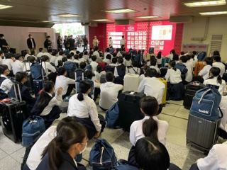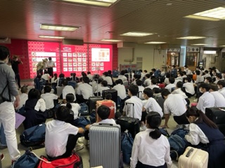 全員、集合時間に間に合い、今出発式です。新大阪にはたくさんの学校の修学旅行生がいます。