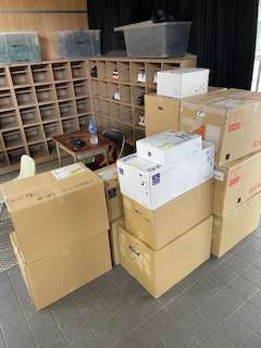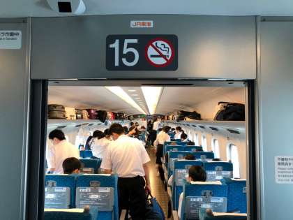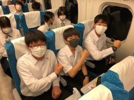 岡山駅を出発しました。学校に、昨日グラバー坂のいずみやさんで購入したお土産が届いたそうです。