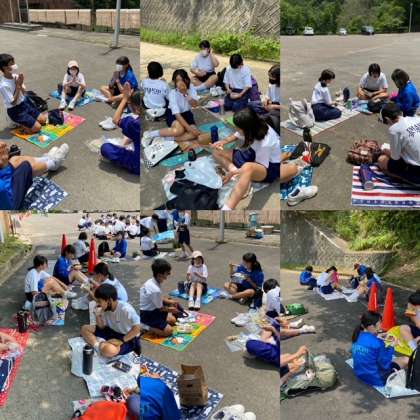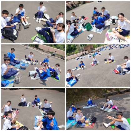 お昼ご飯の様子です。クラス別、班ごとに楽しく食べています。