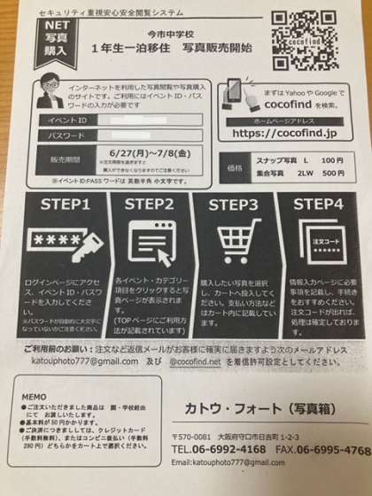 1年生一泊移住の写真販売が昨日より(7/8までの期間で)行われています。すべてネットでの取り扱いとなりますので、注意事項をよくお読み頂き、ご利用のほどよろしくお願いいたします。詳しくは配布プリントをご覧ください。
