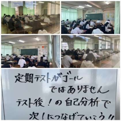 テスト中の様子も、真剣な姿がたくさん見られたので、良い結果につながっていればいいですね。職員室前のホワイトボードには、テスト後こそ大事にしてほしい旨のメッセージがありました。明日からのテスト返却までしっかりと臨んでほしいと思います。