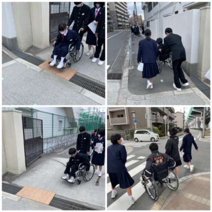 車いす体験では、歩き慣れた通学路ですが、何気ない段差に初めて気づき、アイマスク体験では、想像していた以上の恐怖を感じた様子で、改めて今までのあたりまえが通用しないことに身をもって、気づかされたのではないでしょうか。