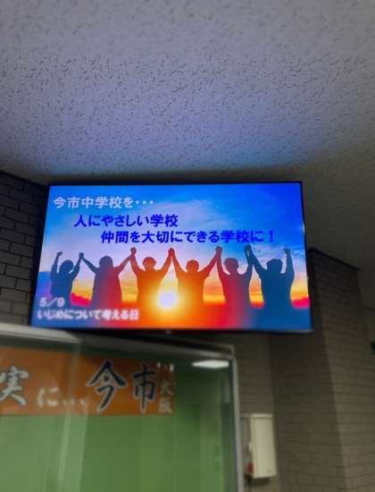 これからも、学校を、互いに楽しく生活でき、安全で安心な場所にしていけるよう、今日のお話を忘れずに、一人ひとりが意識してほしいと思います。(写真は玄関モニターの様子です。予定やお知らせと共に、いじめについて考える日のメッセージも通年で掲示しています。登校時などに目にしてくれればと思います。)