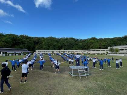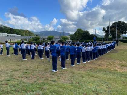 朝の集いでは、いつも体育の授業で取り組んでいる「声出し」から始まり、体操、今日の予定の確認などが行われています。
