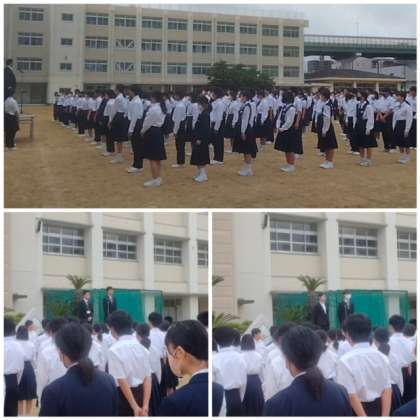 3年生が修学旅行に出発し、留守を預かる1、2年生は、いつも通り全校集会に臨みました。