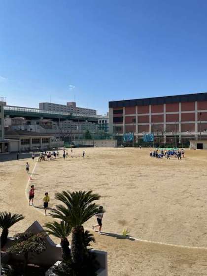 寒い日が続いています。そんな中、運動場では、体育の授業で、1年生が一生懸命に走っていました。